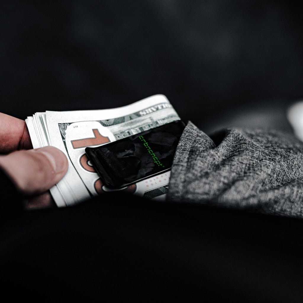 Reduziert auf Bargeld: Geldklammer aus Carbon Fiber (Kohlenstofffaser) oder Forged Carbon. Ultraleicht, robust und auf ewige Spannkraft ausgelegt. Klein im Format, klar in der Linie – gemacht für jeden Tag.