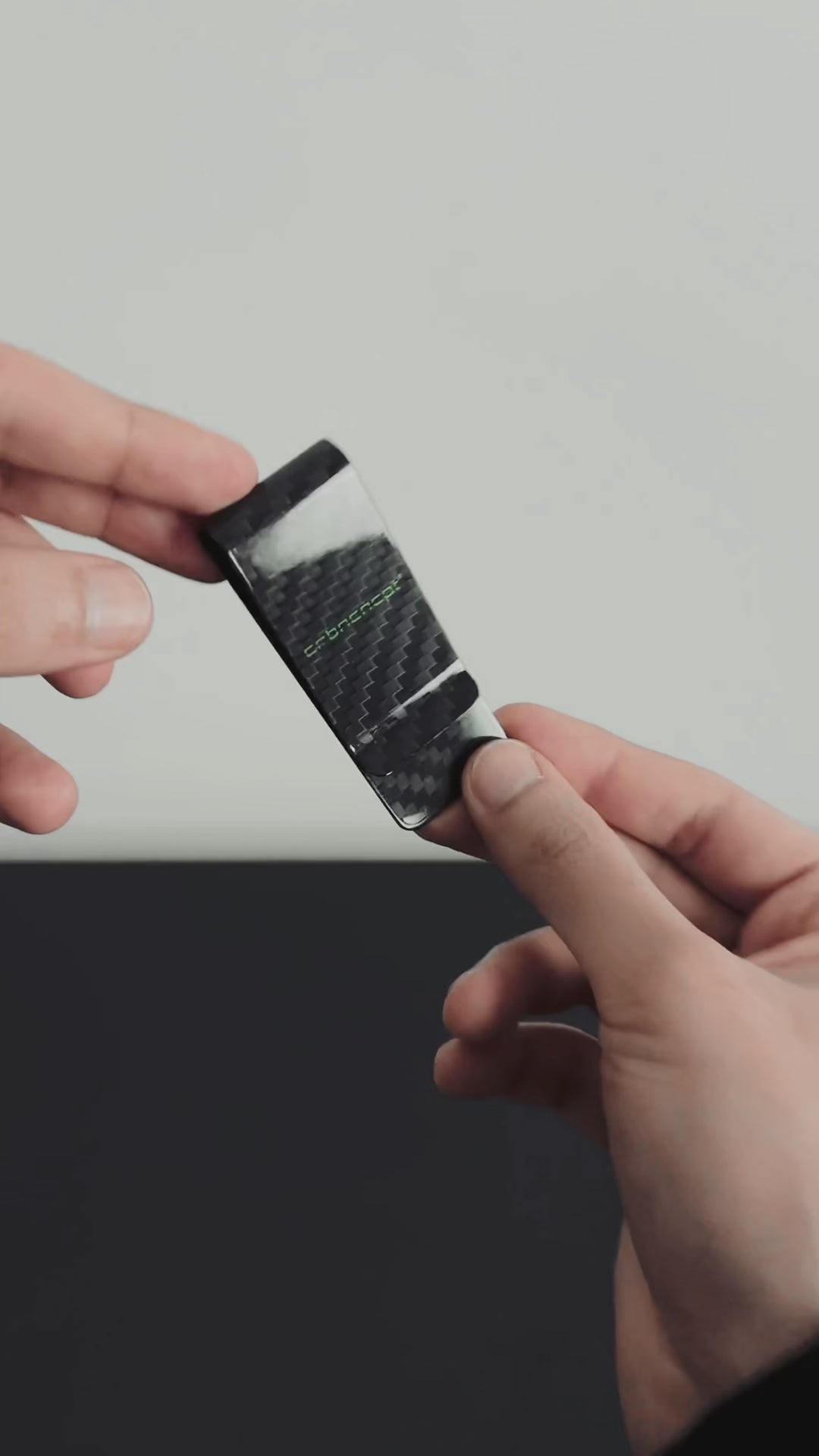 Die Schwarz & graue Carbon Struktur gibt Dir und Deiner Geldklammer ein Elegantes & Dynamisches auftreten und durch unser Glossy Finish noch das gewisse Extra.