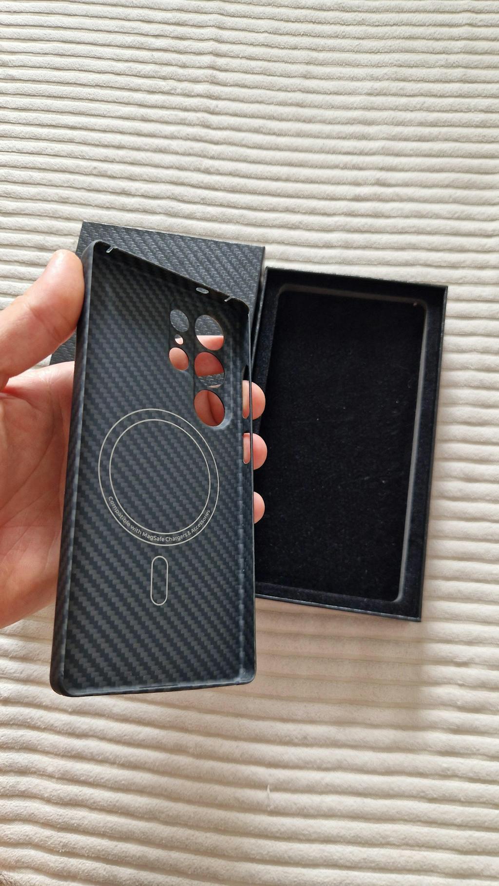 Deine Carbon x Aramid Schutzhülle besitzt einen starken integrierten Magnetring, damit kannst du alle Samsung MagSafe Produkte wie gewohnt sicher befestigen und nutzen, auch das induktive Laden klappt durch die Hülle problemlos.